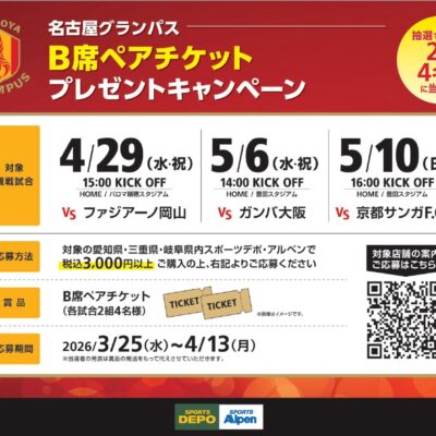 【名古屋グランパス】チケットプレゼントキャンペーン開催!試合観戦のチャンス!